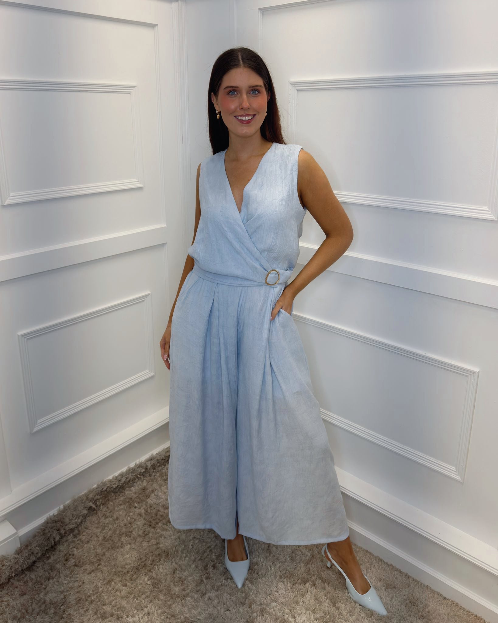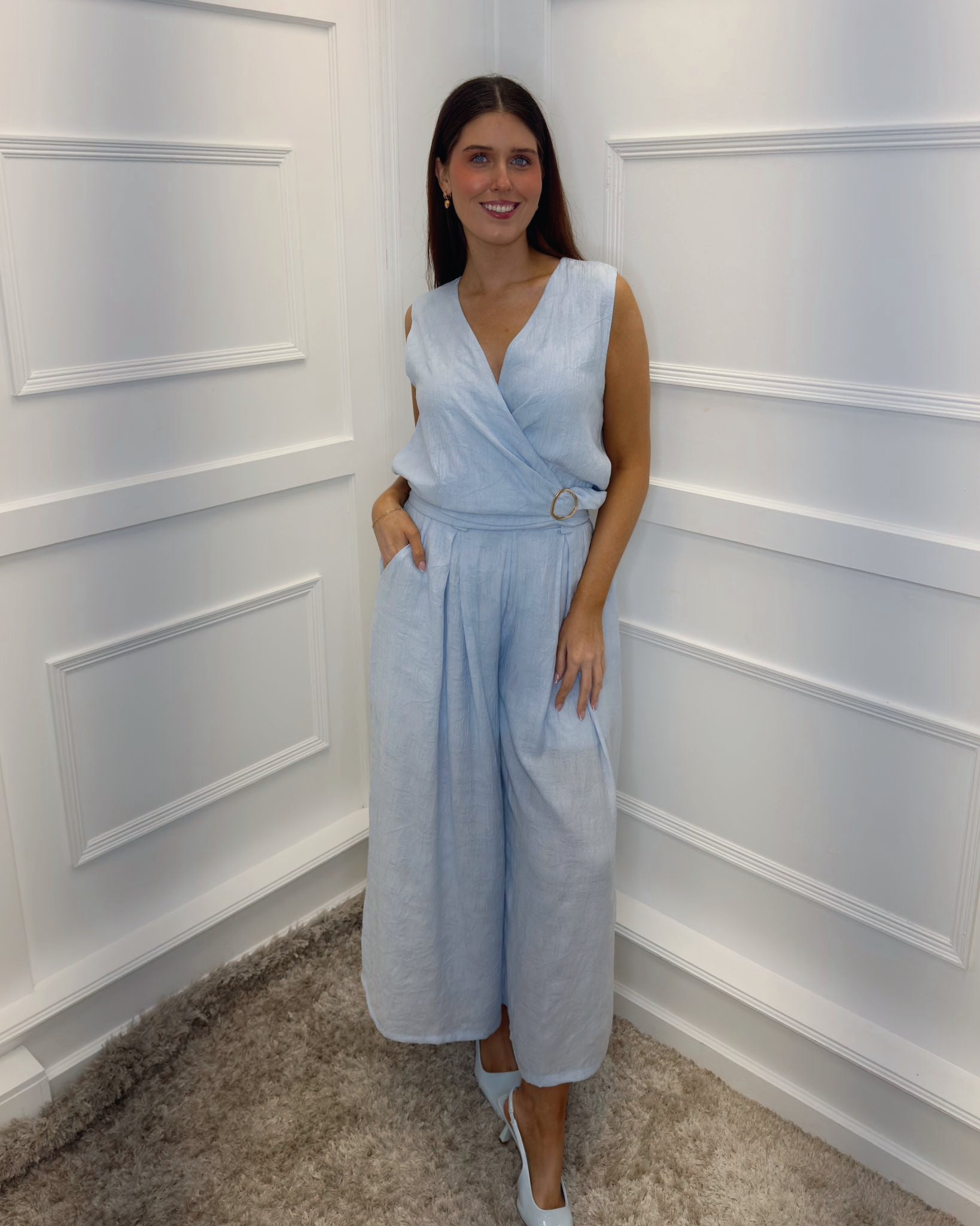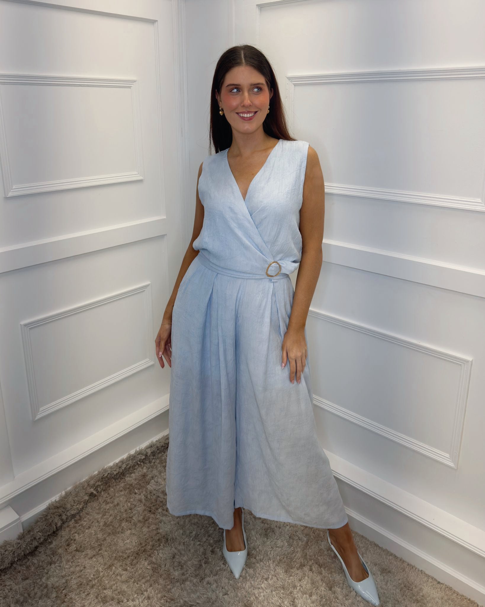 Make a confident statement in this sophisticated sleeveless two piece, designed to flatter and impress. The flattering wrap-effect V-neckline draws the eye upward, while the cinched waist with gleaming golden buckle creates an instantly polished silhouette. Flowing wide-leg pants offer comfort without compromising style, making this the ideal choice for everything from evening events to elevated casual occasions. Effortlessly chic and undeniably versatile.
