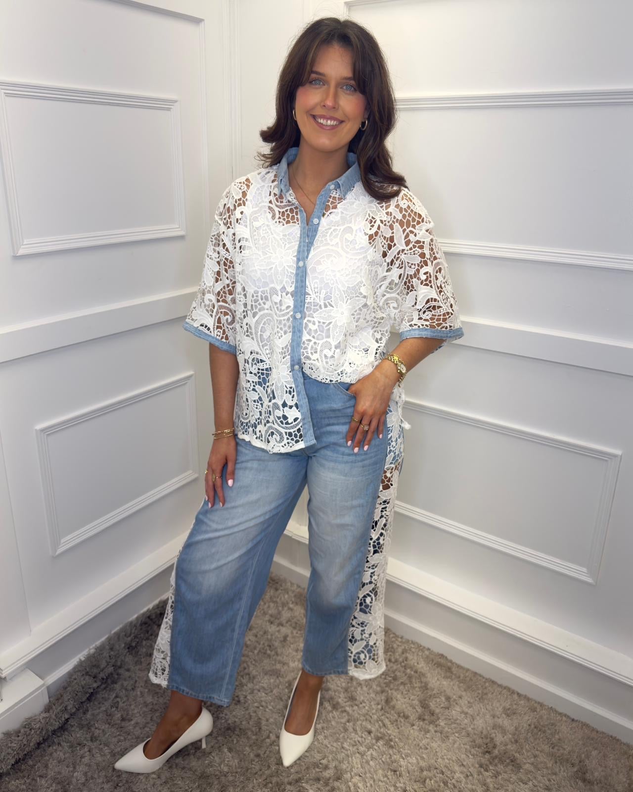 Sally Crochet Shirt with Denim Detail - White