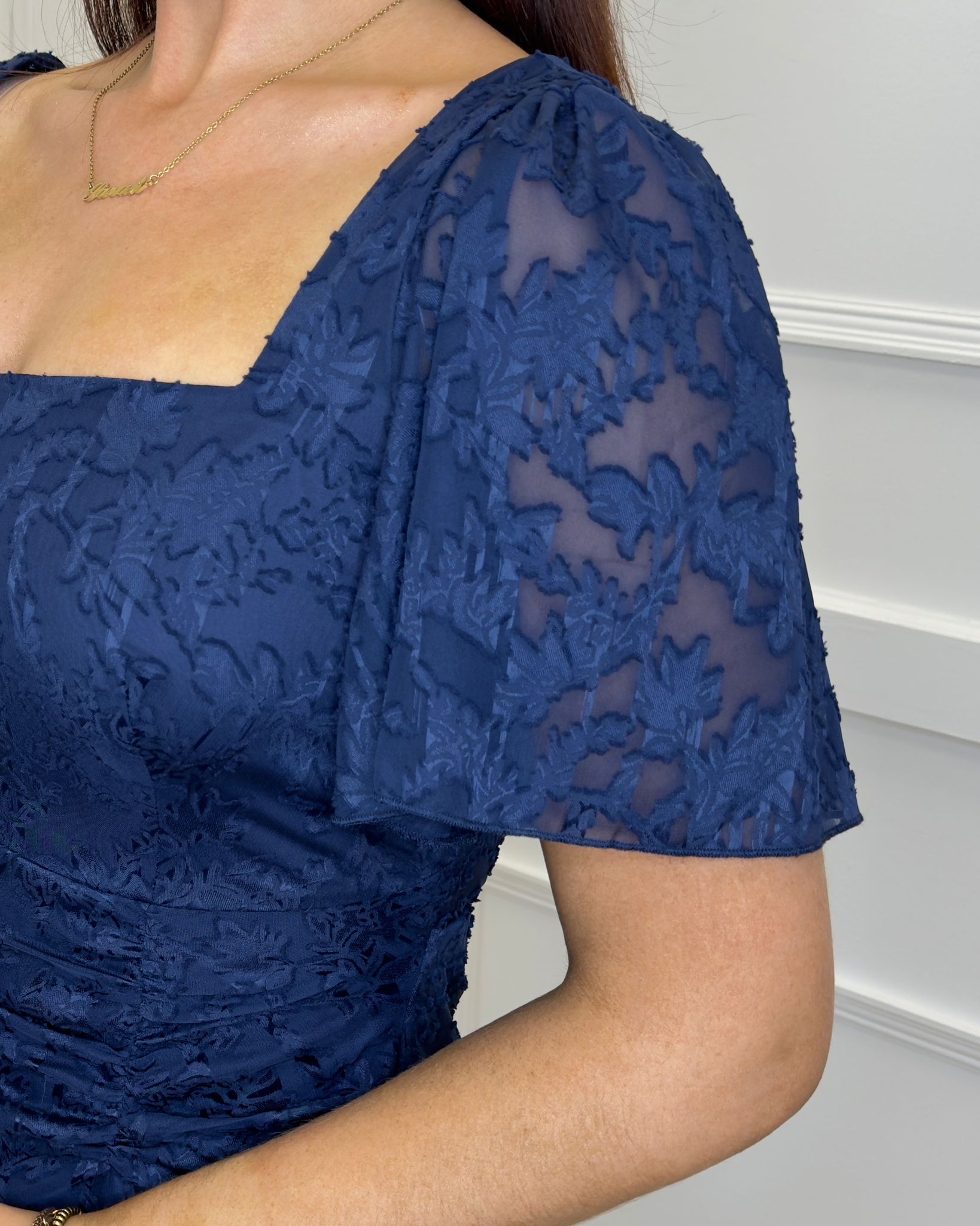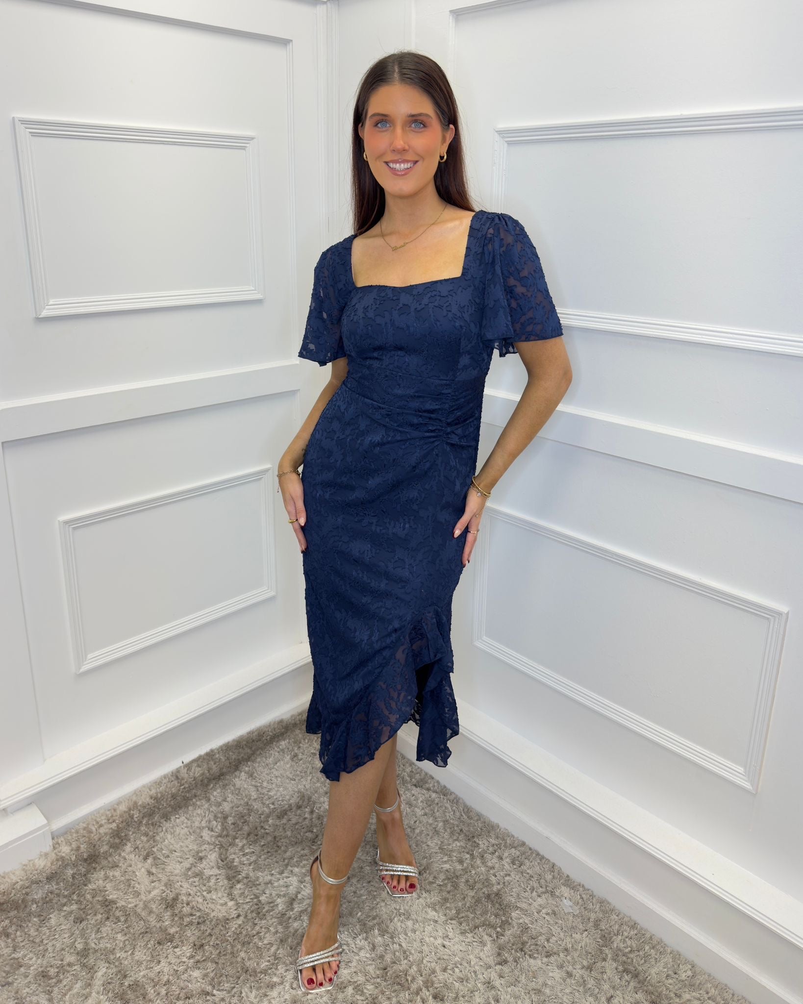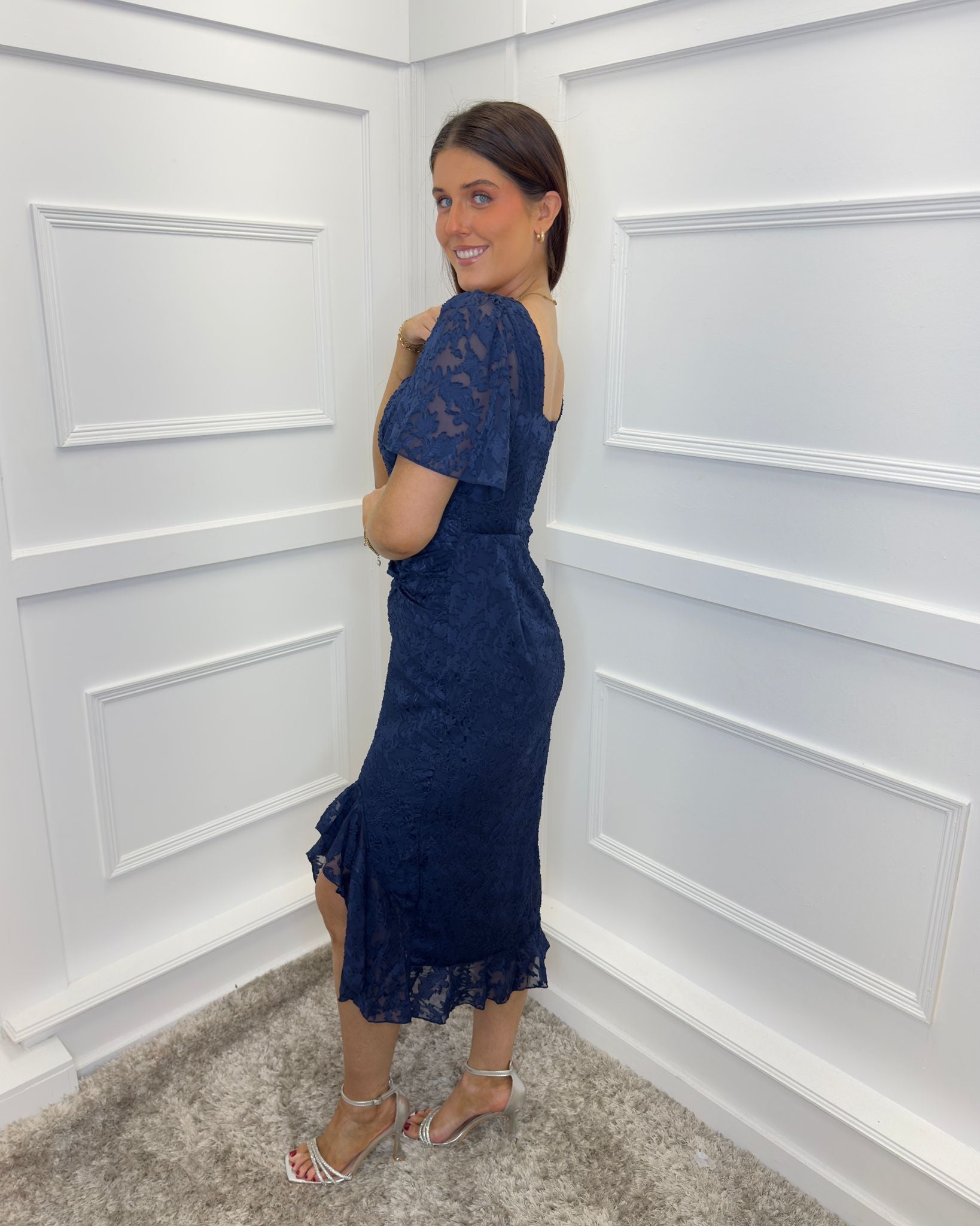 Heidi Floral Burnout Ruched Midi Dress - Navy