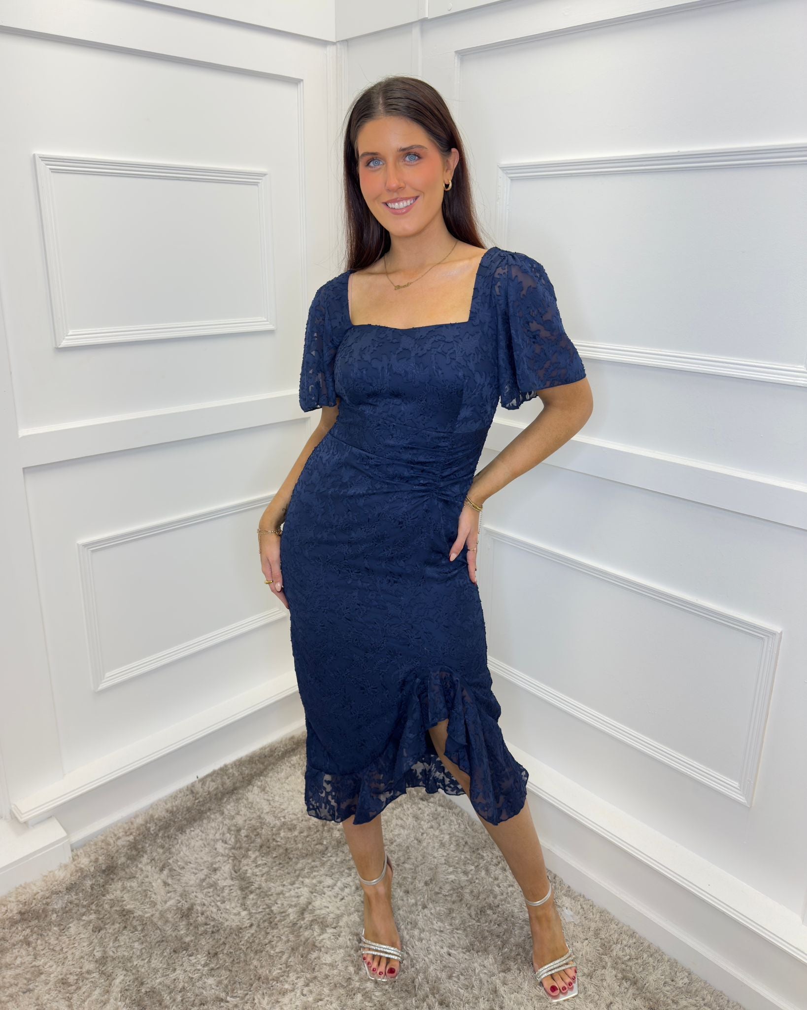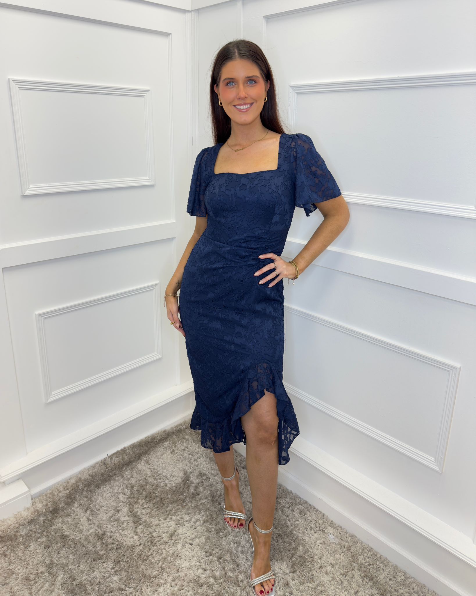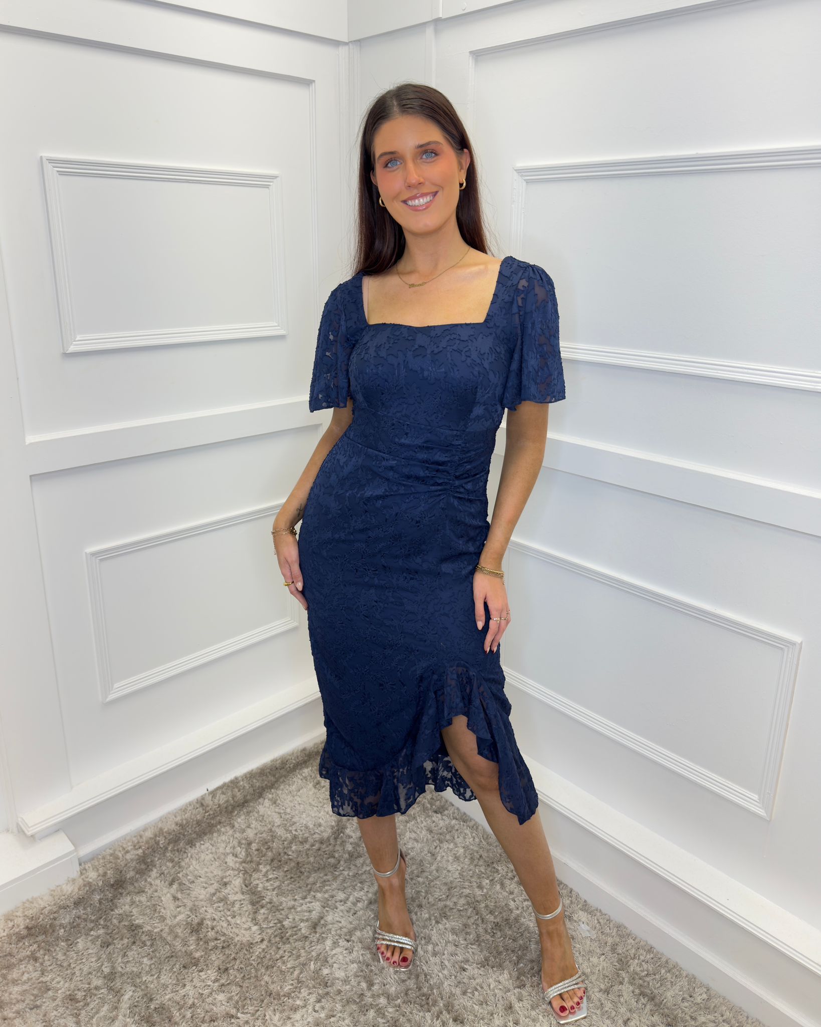 Heidi Floral Burnout Ruched Midi Dress - Navy