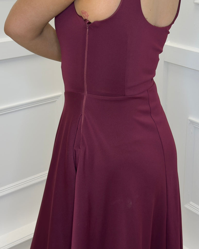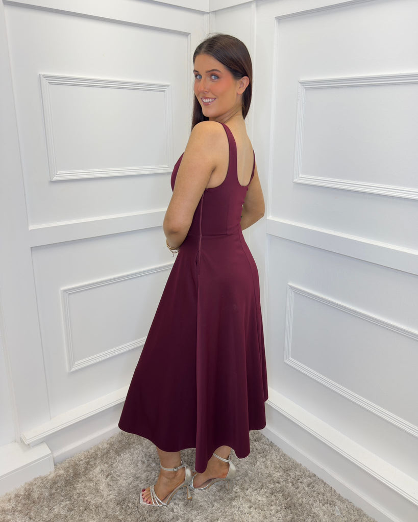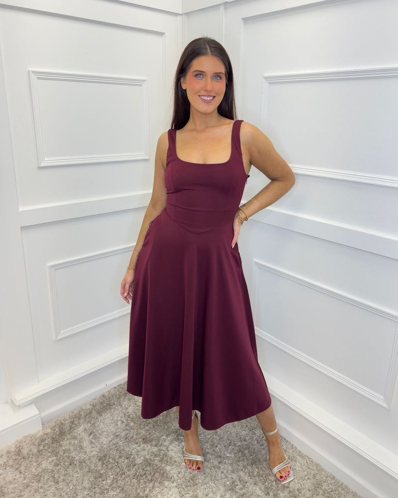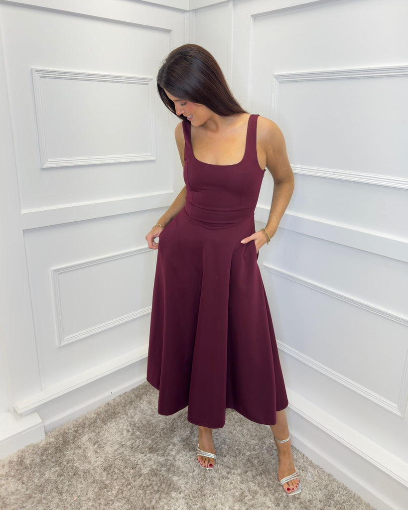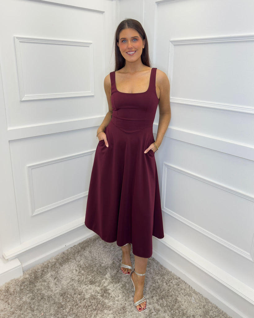 Exude feminine elegance in our Plum Square Neck A-line Midi Dress. Featuring a structured body with an A-line midi skirt, hidden functional pockets, a square neckline and a side zip closure. Wear this classic piece with some court heels and a matching clutch for the perfect occasion look.