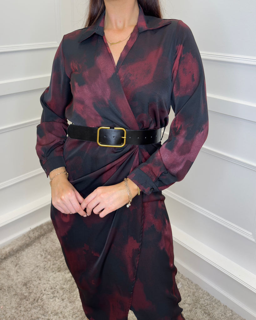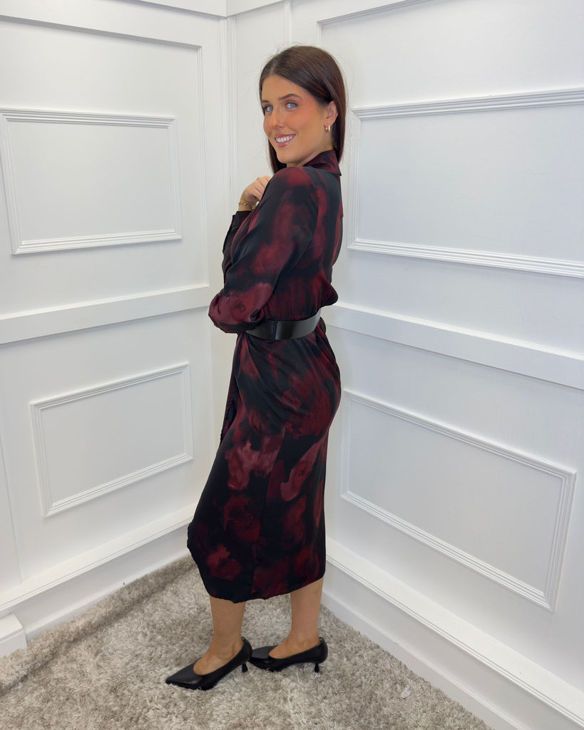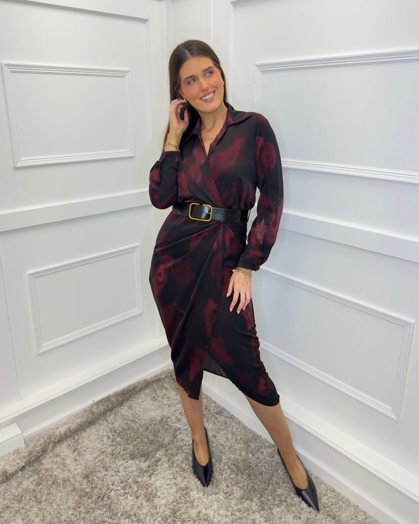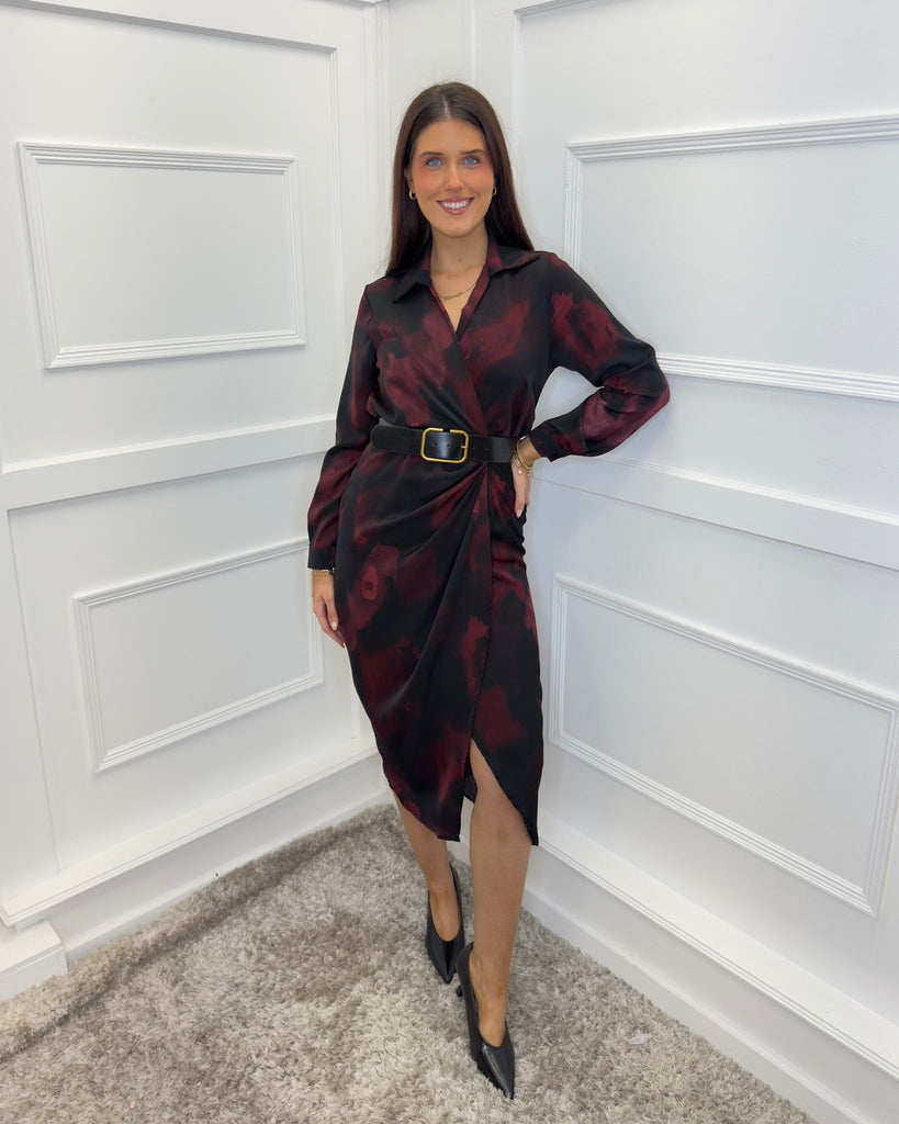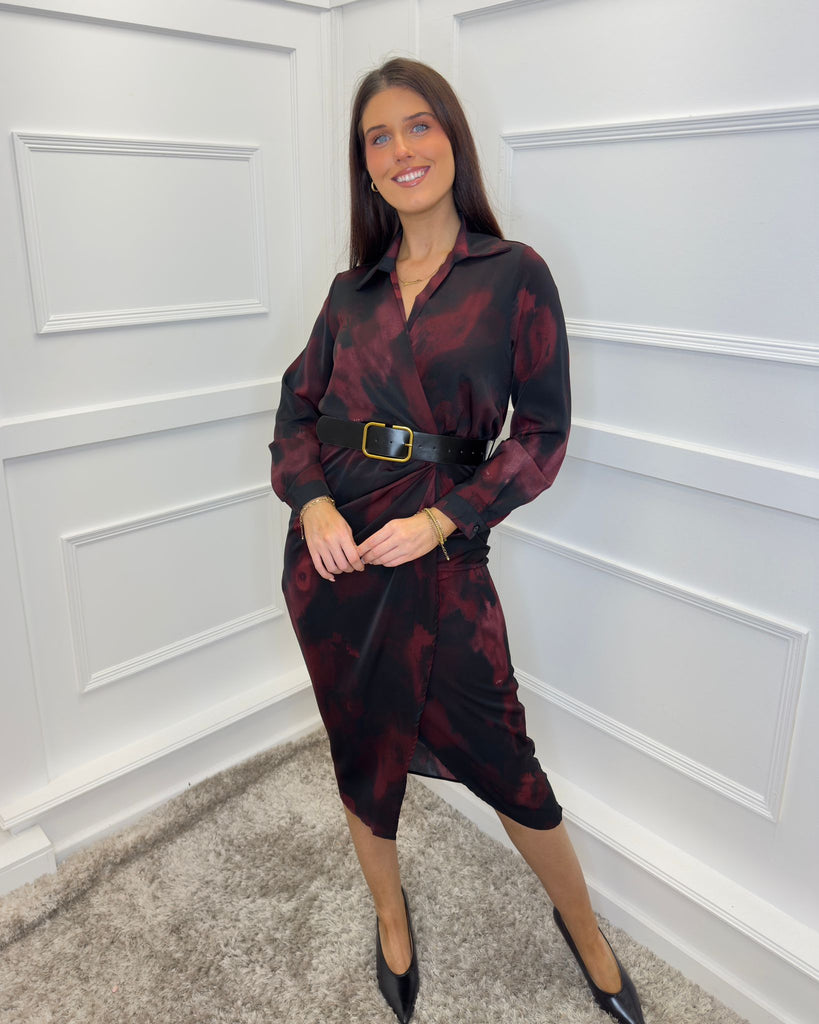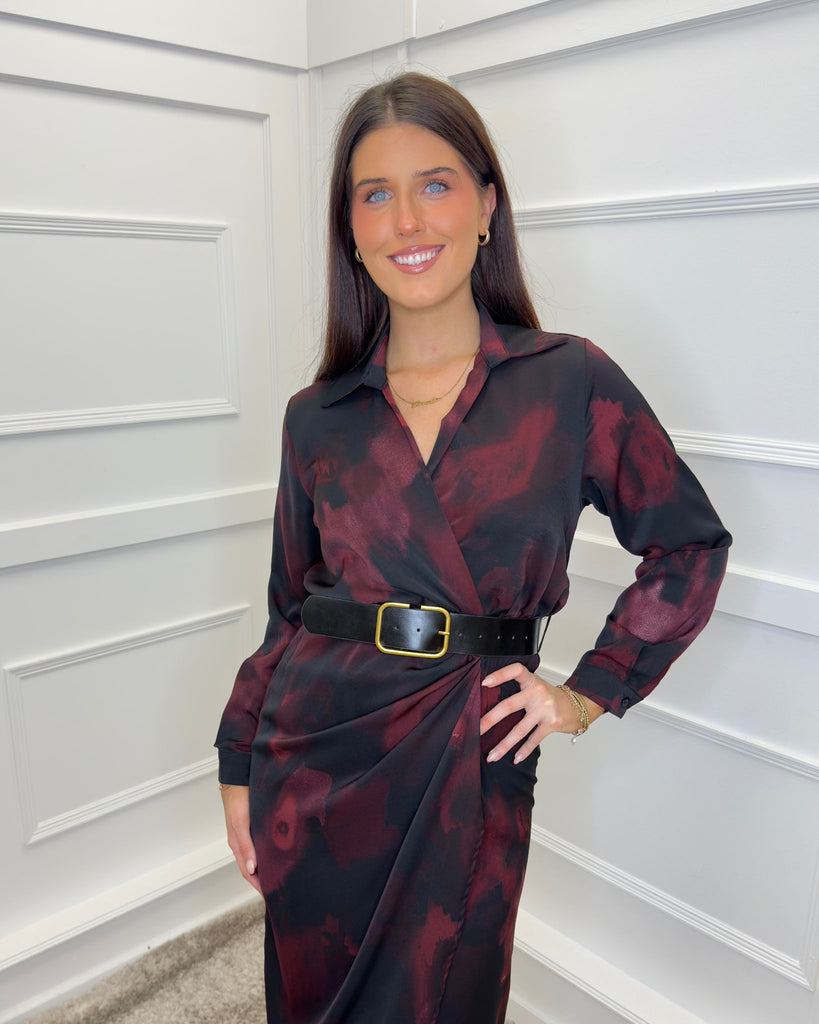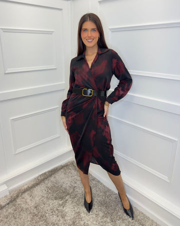 Our must-have Plum And Black Smudge Print Belted Wrap Midi Shirt Dress will effortlessly take you from day to night. Featuring a classic shirt collar, long cuffed sleeves, a wrap top, an elasticated back waist, a black faux leather belt and a midi wrap skirt. Style it with boots for a casual day look or dress it up with heels and a matching bag for the evening.