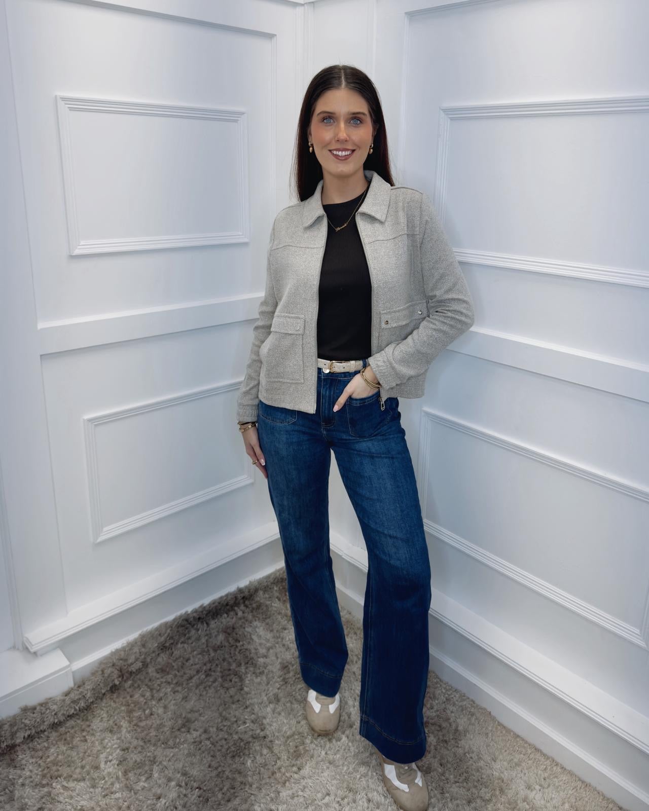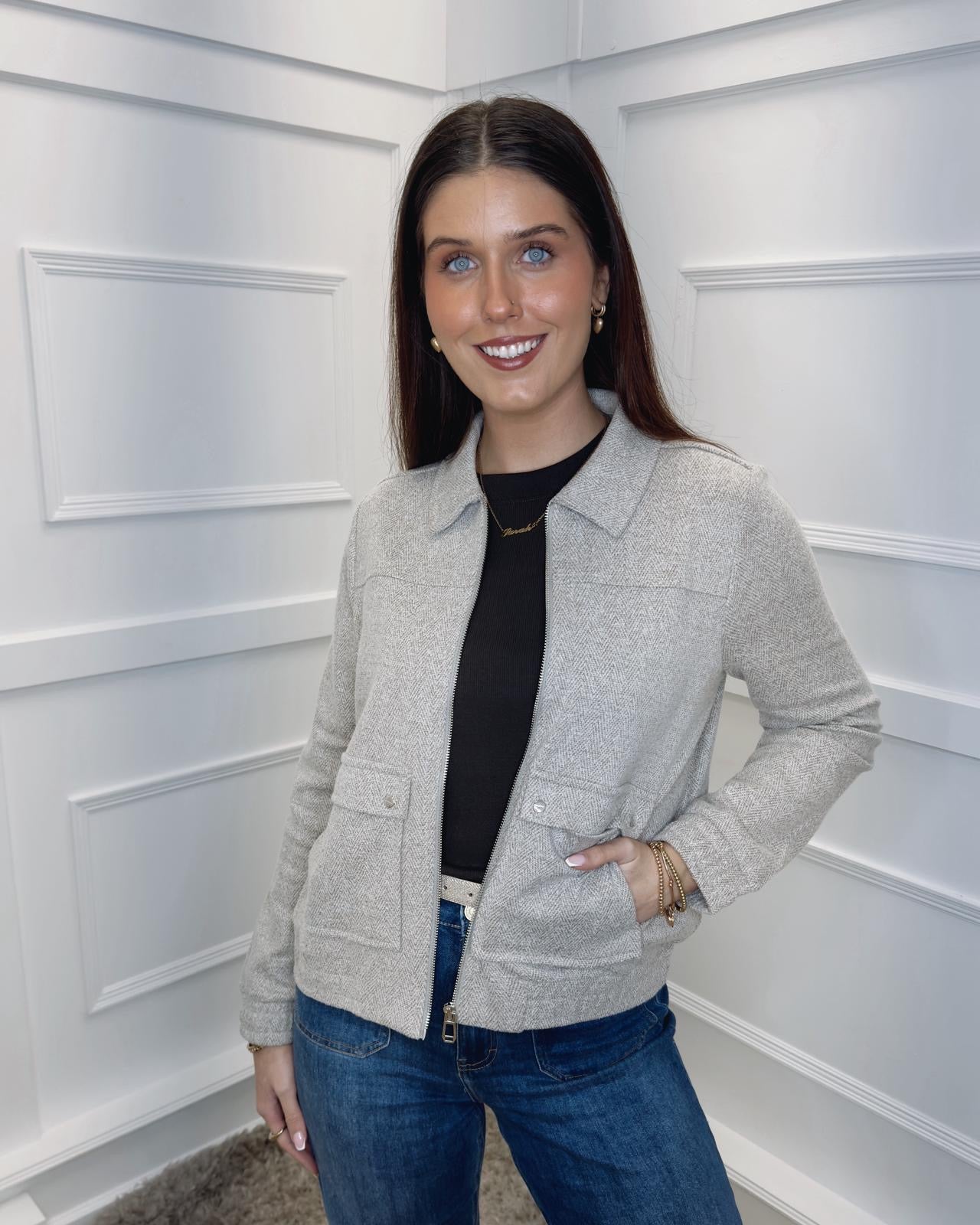 The herringbone blouson jacket from Street One for women is perfect for everyday wear, featuring a shirt collar, long sleeves, a zip fastening, patch pockets with buttons, and an elasticated waistband for a comfortable fit. The cotton blend provides comfort and a clean, versatile look. Choose this jacket if you're looking for an uncomplicated, stylish casual jacket.