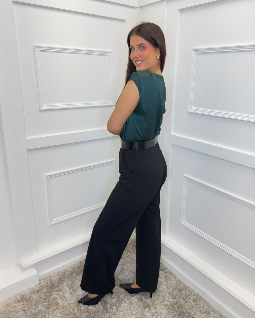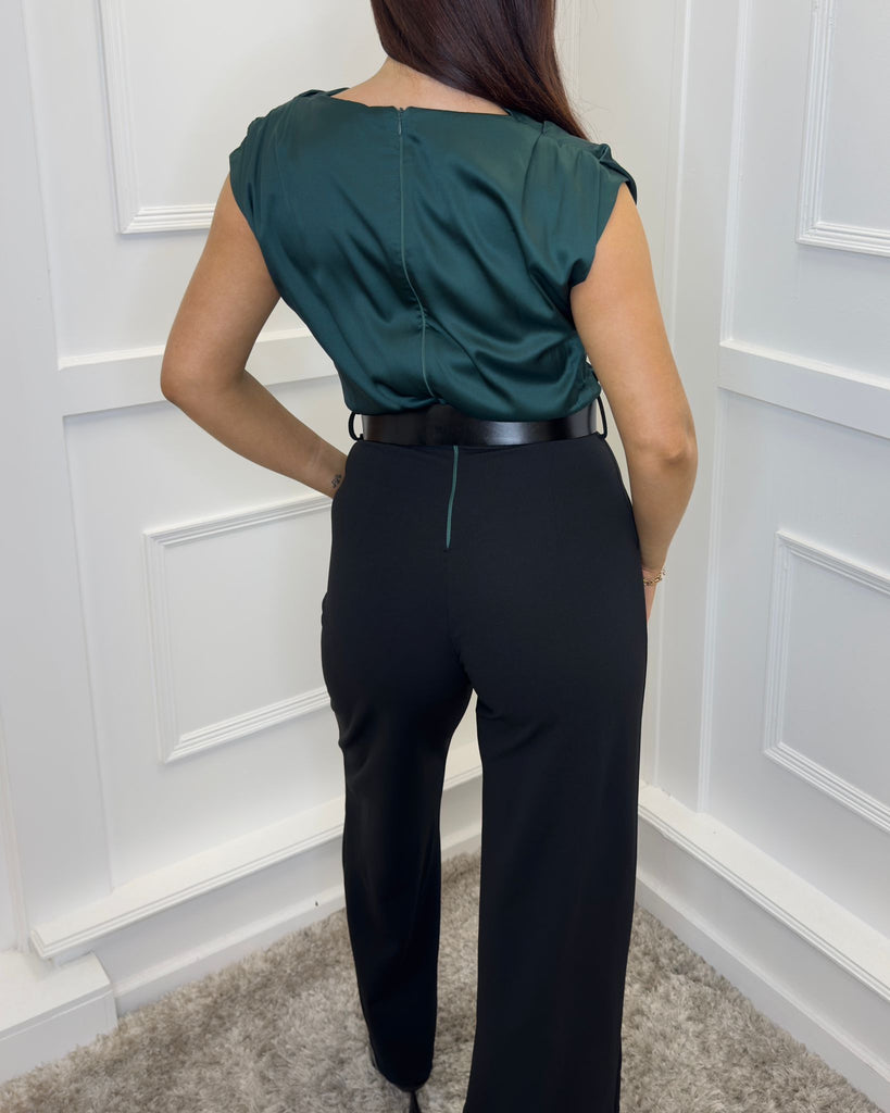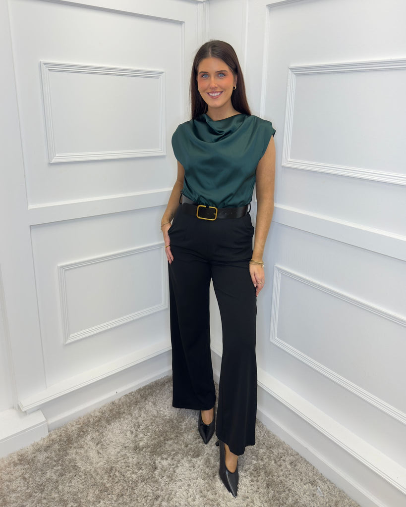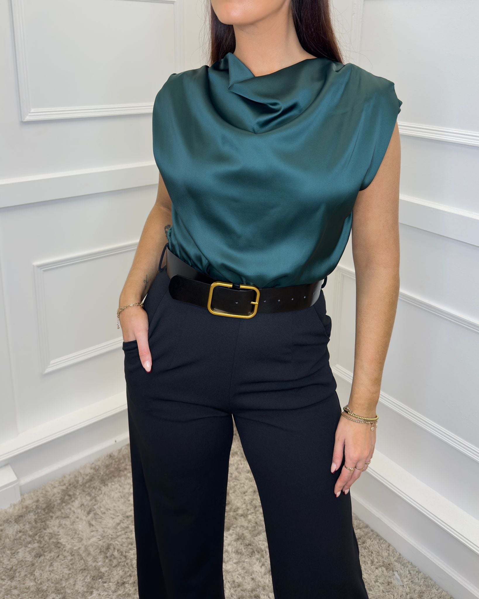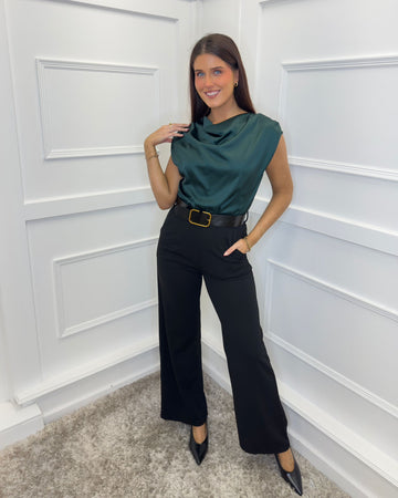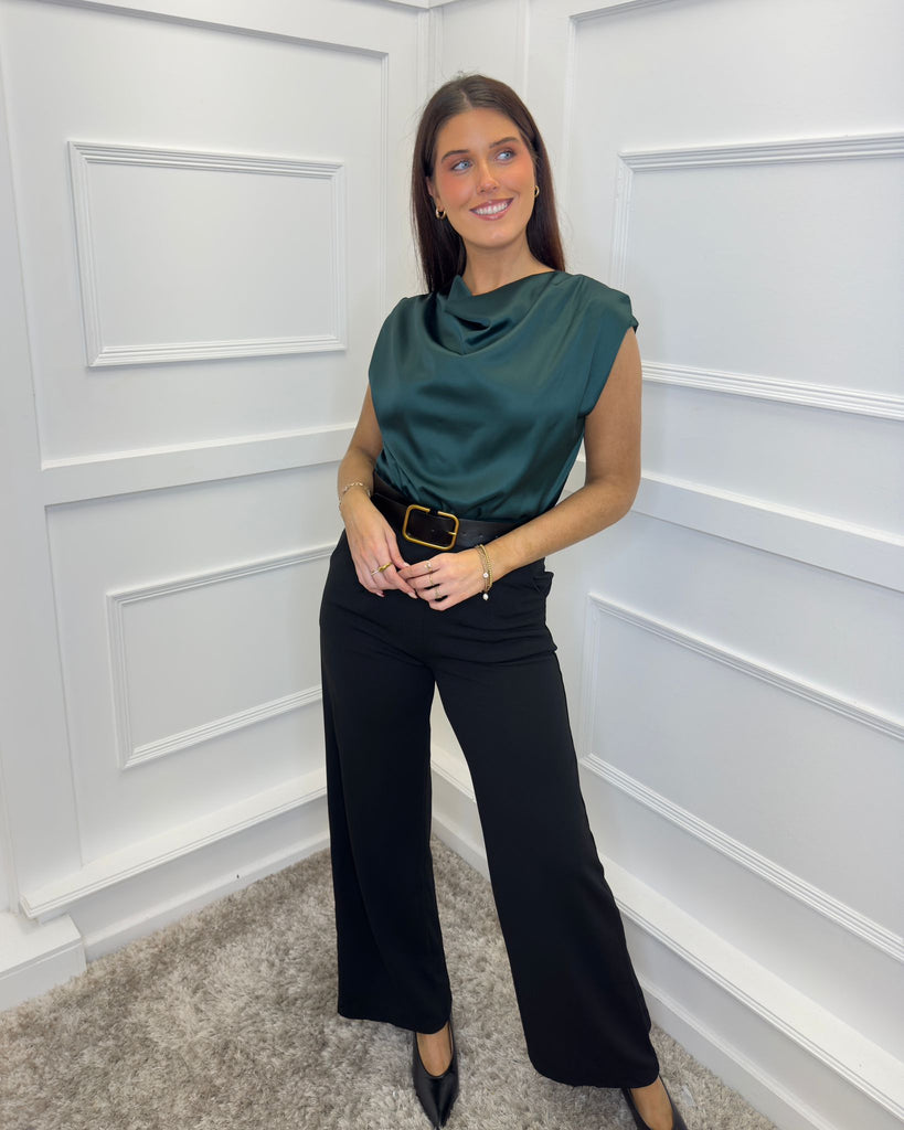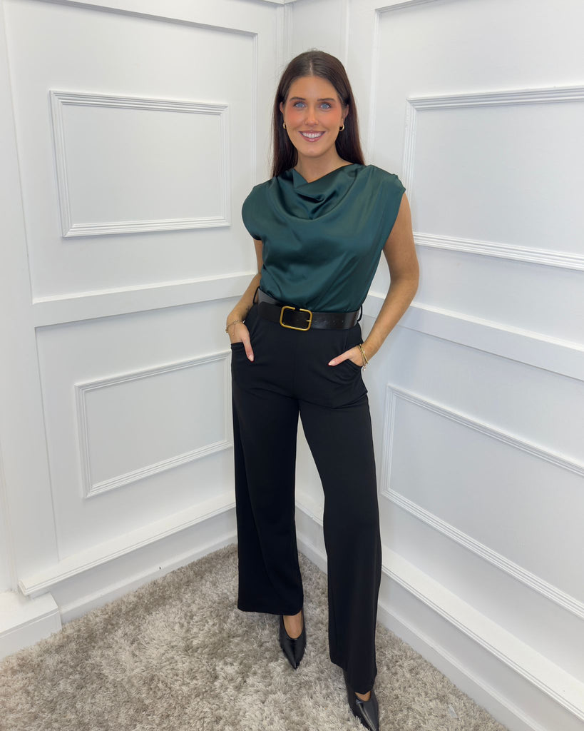 Elevate your wardrobe with our effortlessly chic Teal 2 in 1 Draped Neck Belted Wide Leg Jumpsuit. Featuring a satin-feel top with a draped cowl neckline, full length wide leg trousers, side pockets, a zip-up back and a statement faux leather belt. Pair it with court heels and your favourite accessories for a sophisticated occasion look.