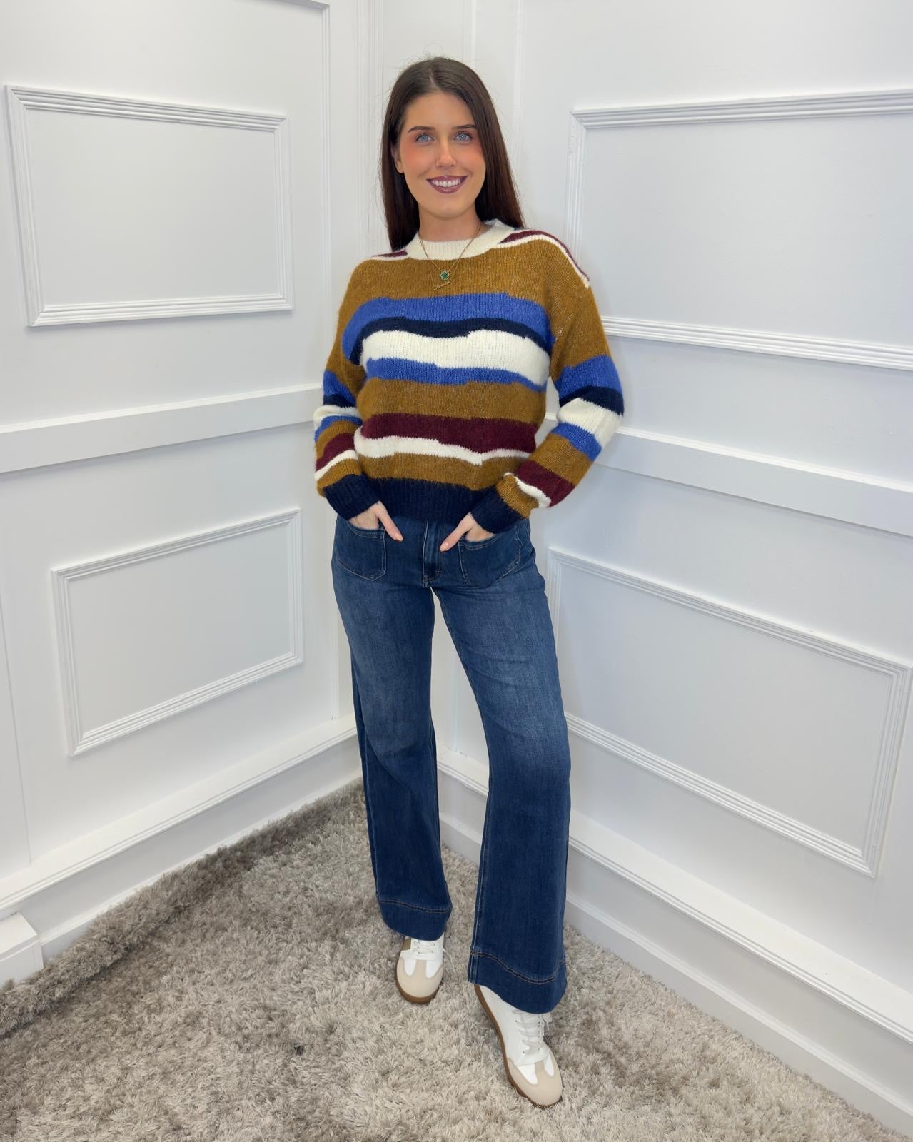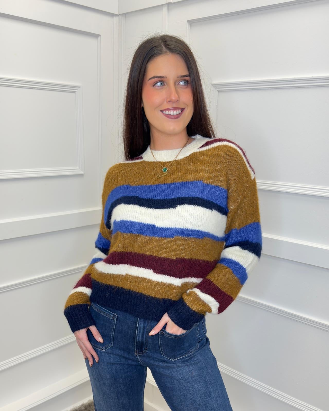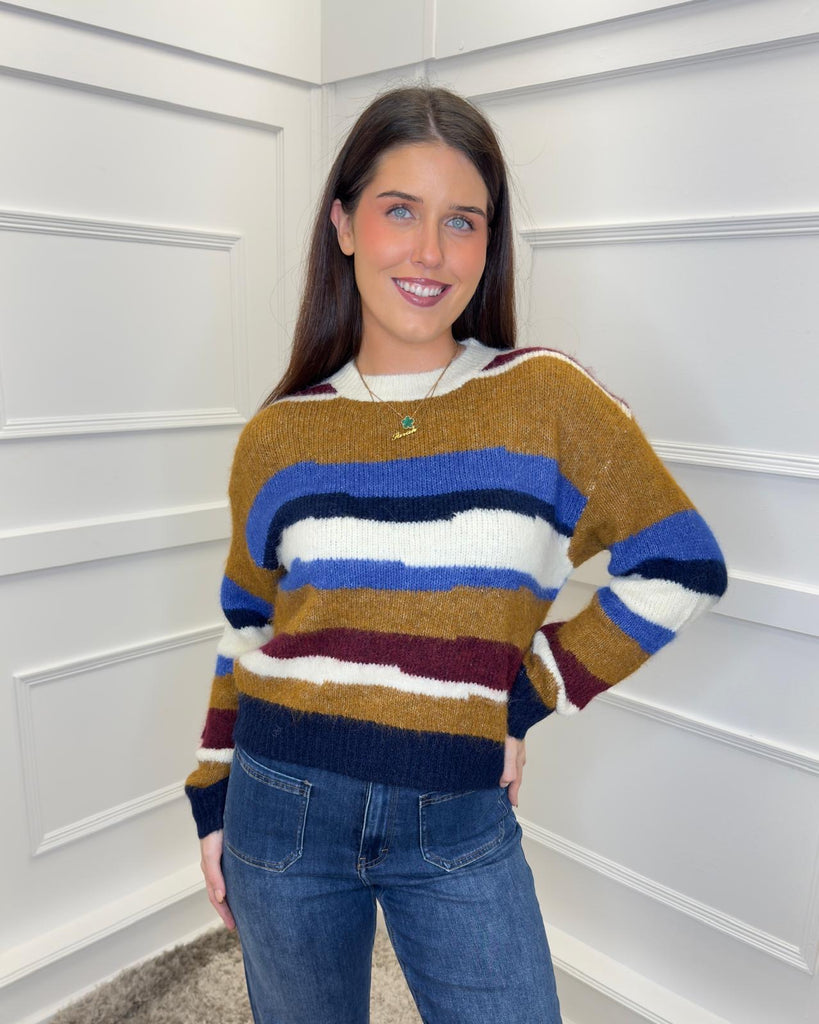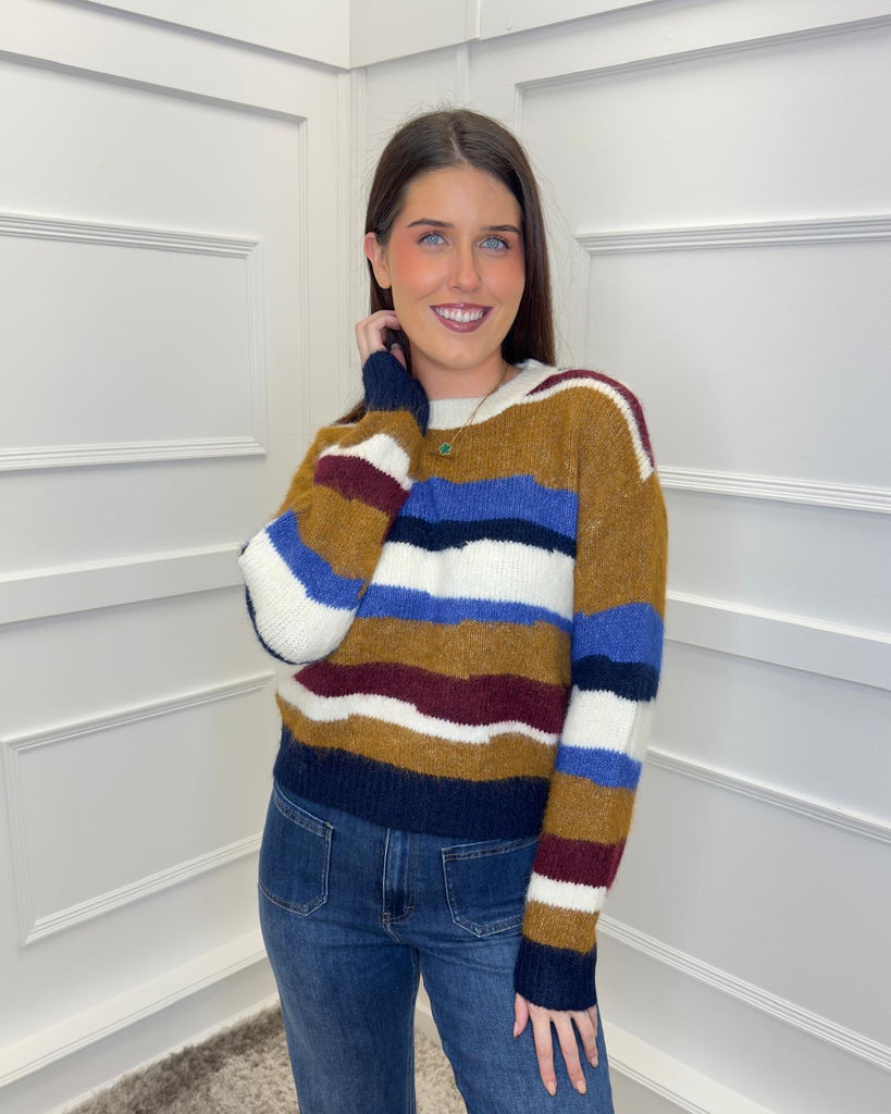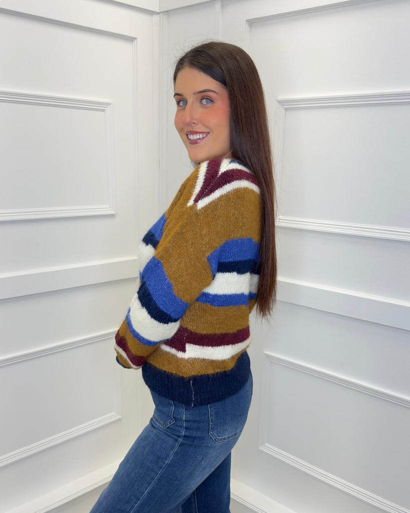 Crafted from ultra-comfortable fluffy knit, it combines a loose fit with a ribbed crew neck for a relaxed yet bold look. Its vibrant colors and seventies vibe make it a season must-have, perfect to wear with light jeans or a midi skirt.