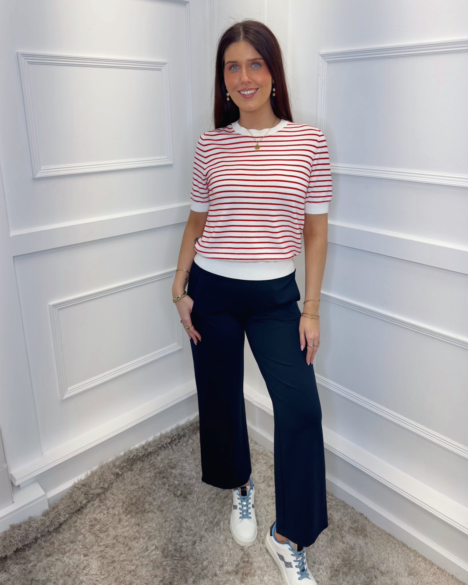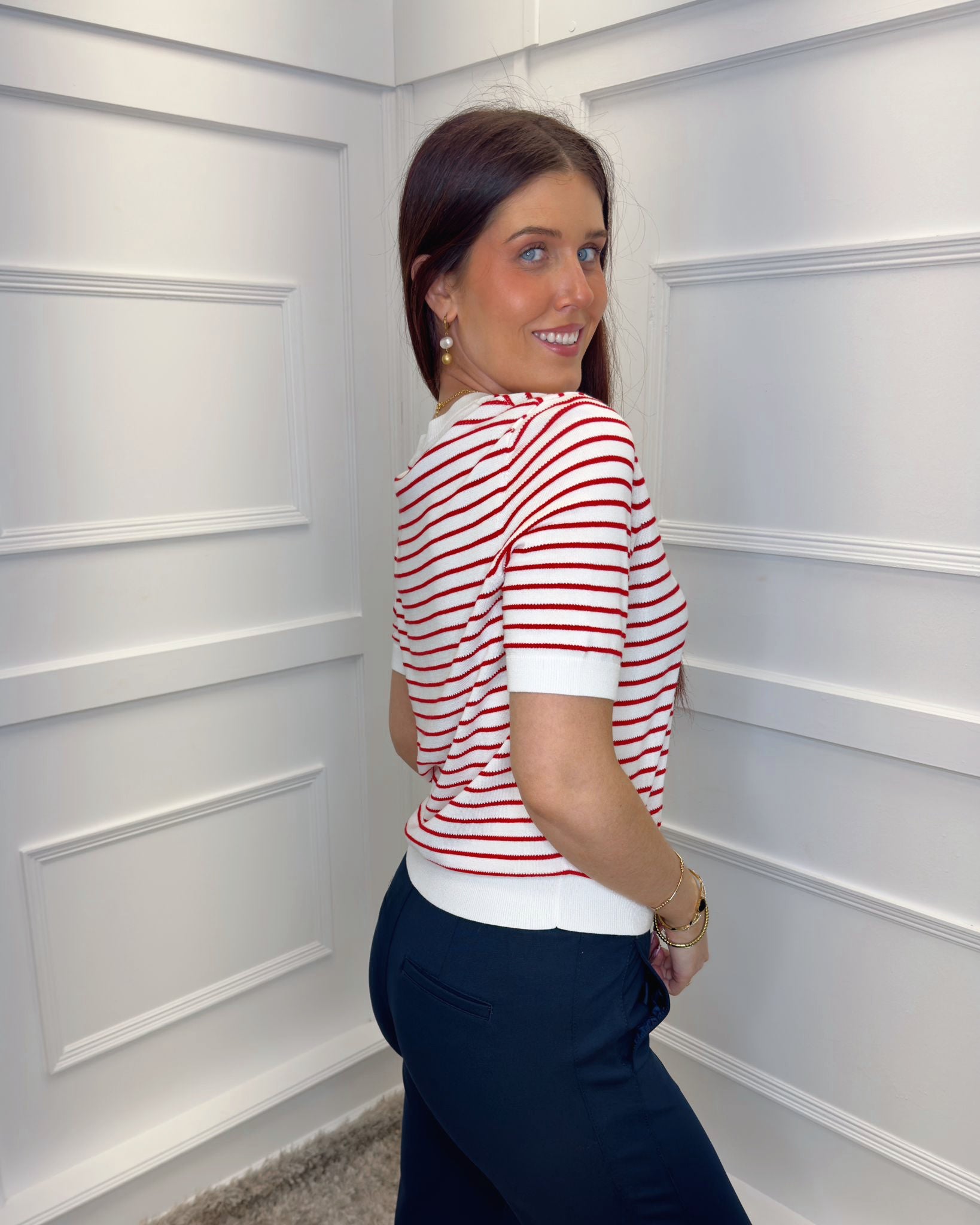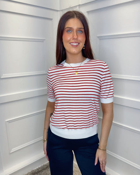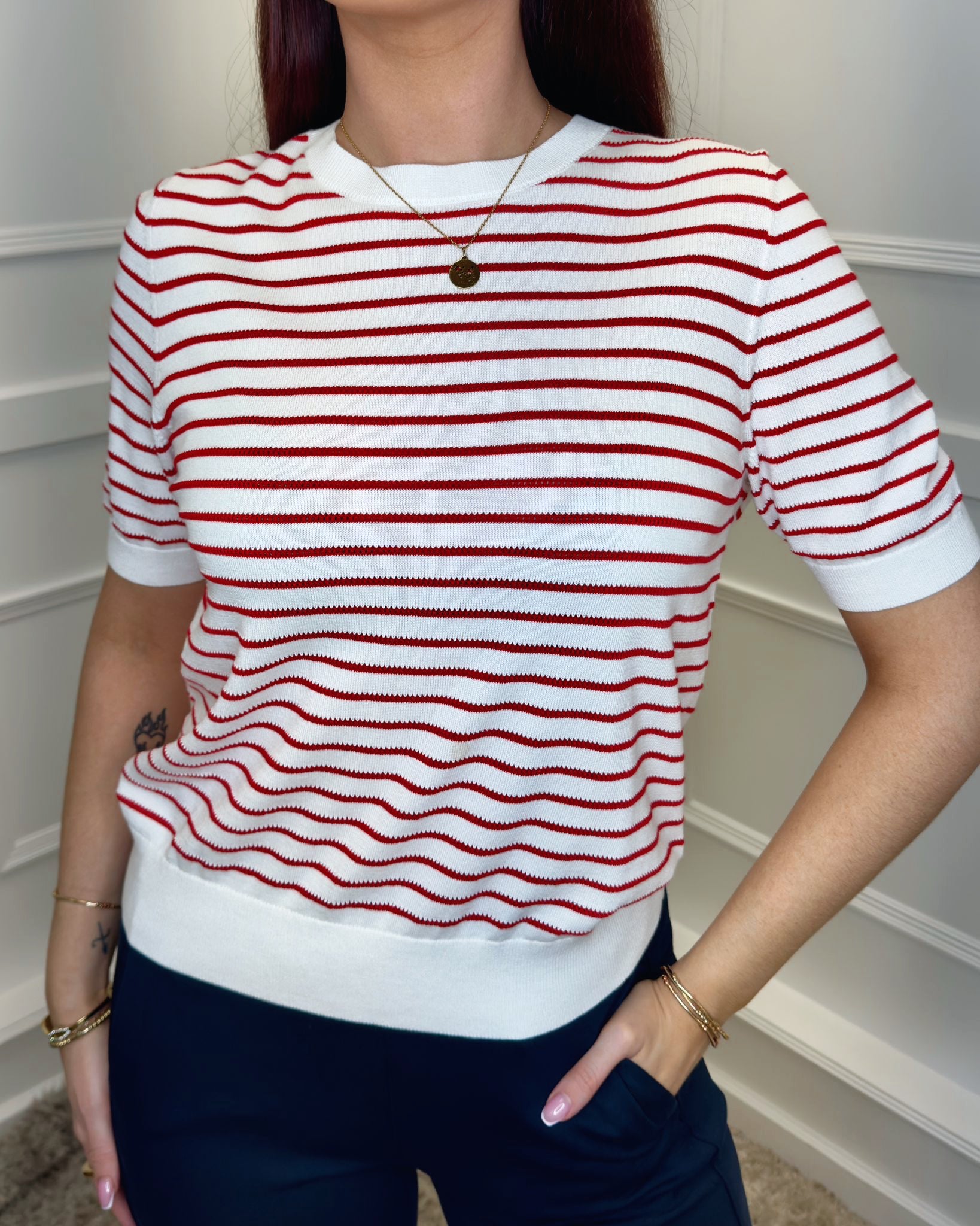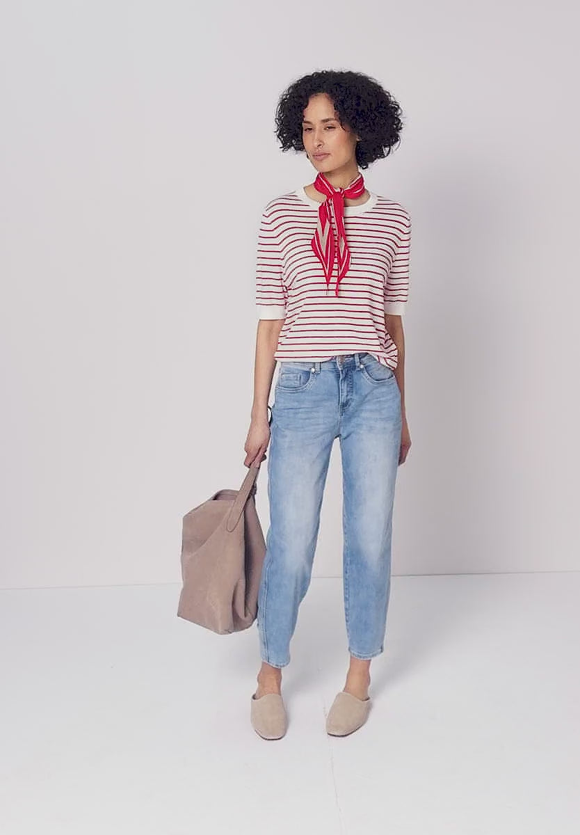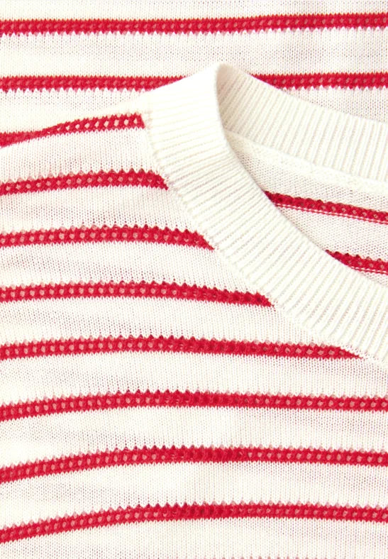 This summery knit sweater from Street One for women features a soft viscose blend and a modern striped pattern. The short sleeves create a light and fresh look, while the fine texture adds depth to the sweater. A classic crew neck completes the design. A versatile casual piece that you can easily pair with jeans, shorts, or skirts.
