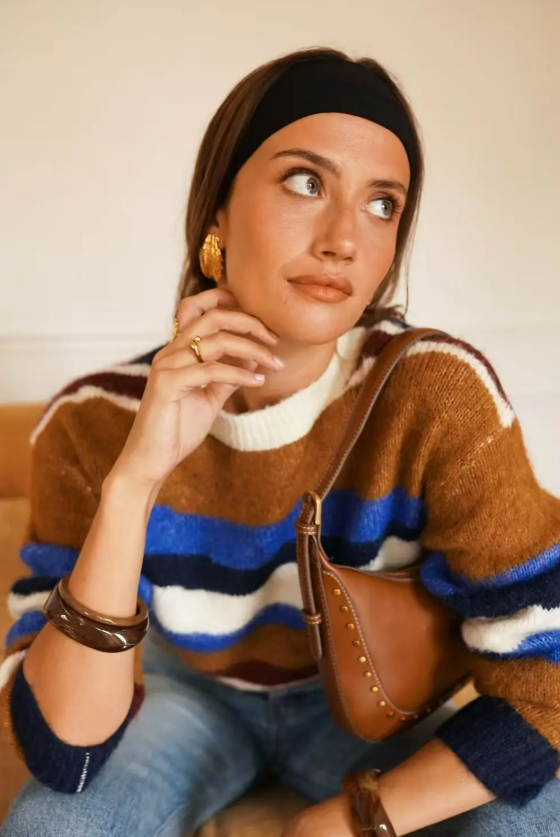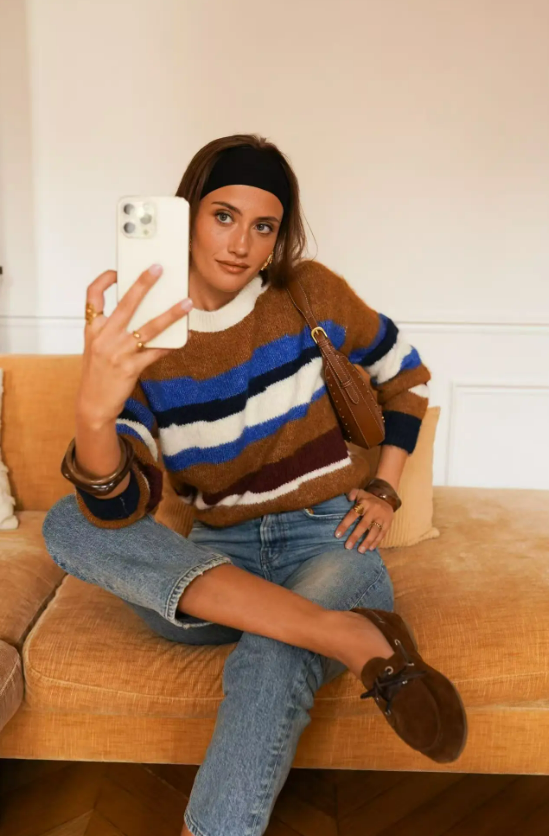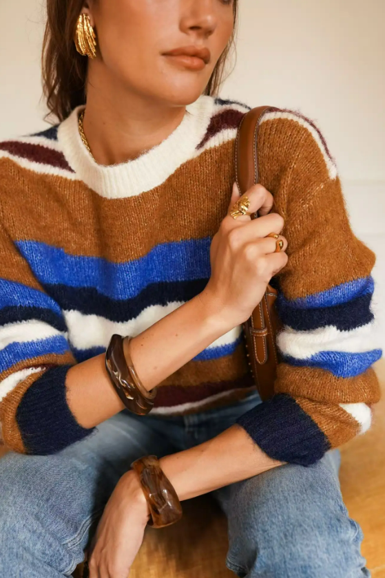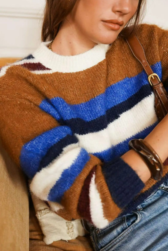 Crafted from ultra-comfortable fluffy knit, it combines a loose fit with a ribbed crew neck for a relaxed yet bold look. Its vibrant colors and seventies vibe make it a season must-have, perfect to wear with light jeans or a midi skirt.