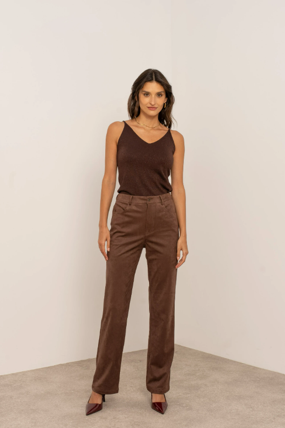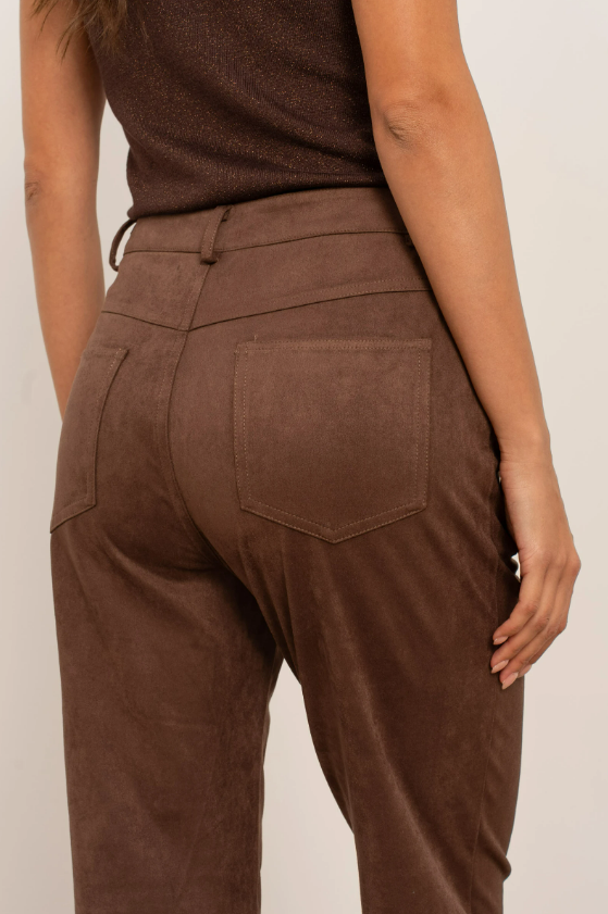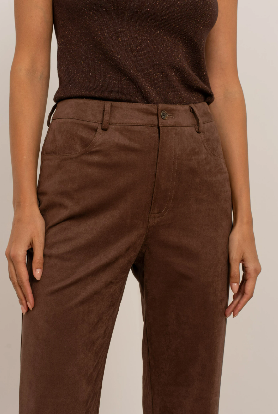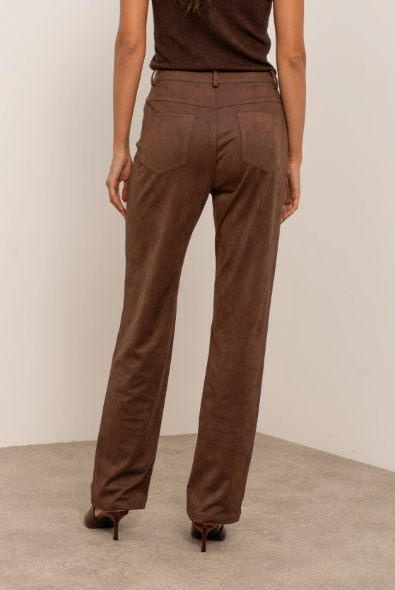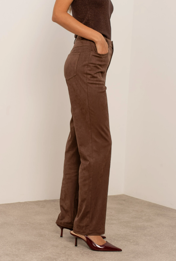 Elevate your everyday wardrobe with these sophisticated Polly Straight Leg Suede Trousers in rich dark brown. Featuring a commanding high-waist silhouette that flatters and defines, they combine structured tailoring with unexpected comfort through their soft, gently stretchy suede fabric. The secure zip and button closure keeps you polished all day, while discreet side pockets add practical functionality. Perfect for transitioning from office to evening, these trousers deliver that coveted balance of refined elegance and relaxed wearability that makes getting dressed effortless.